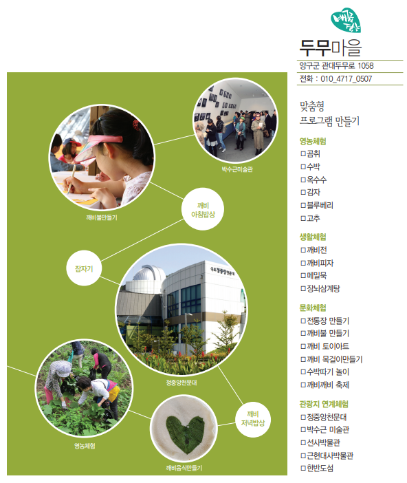 (사)양구군농촌체험관광협의회 | 주소 : 강원 양구군 남면 양남로 319-31 | 대표전화 : 010-9990-0957 | 전화 : 033)482-1427 | 팩스 : 033)481-3312 | 사업자등록번호 : 221-82-16162