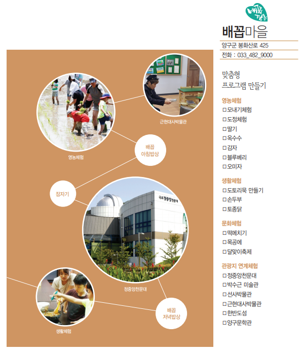 (사)양구군농촌체험관광협의회 | 주소 : 강원 양구군 남면 양남로 319-31 | 대표전화 : 010-9990-0957 | 전화 : 033)482-1427 | 팩스 : 033)481-3312 | 사업자등록번호 : 221-82-16162