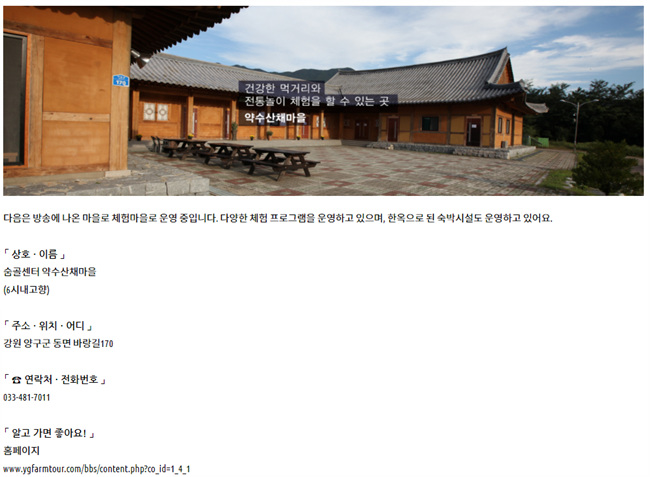 (사)양구군농촌체험관광협의회 | 주소 : 강원 양구군 남면 양남로 319-31 | 대표전화 : 010-9990-0957 | 전화 : 033)482-1427 | 팩스 : 033)481-3312 | 사업자등록번호 : 221-82-16162