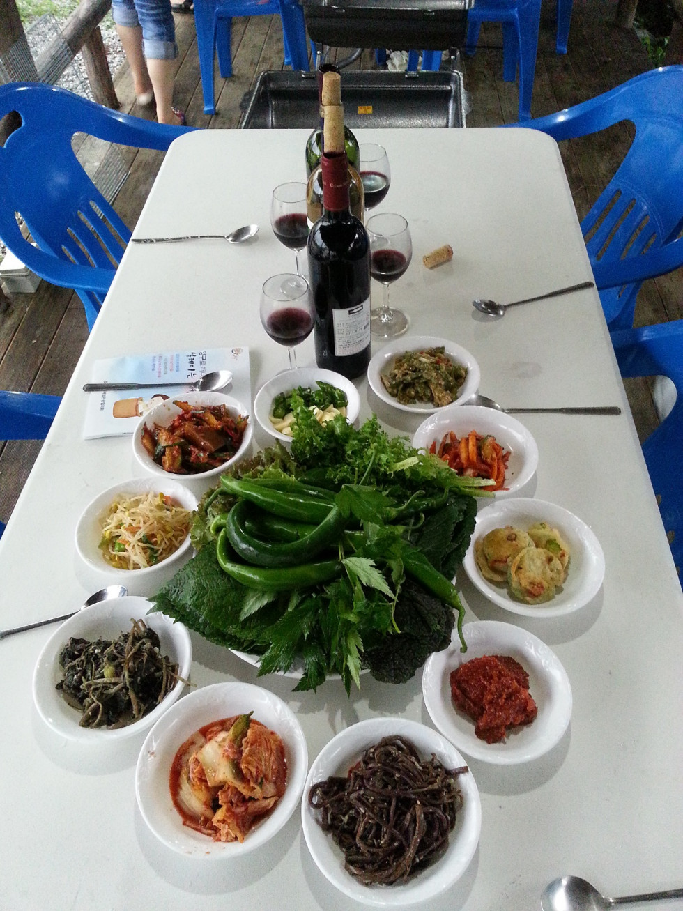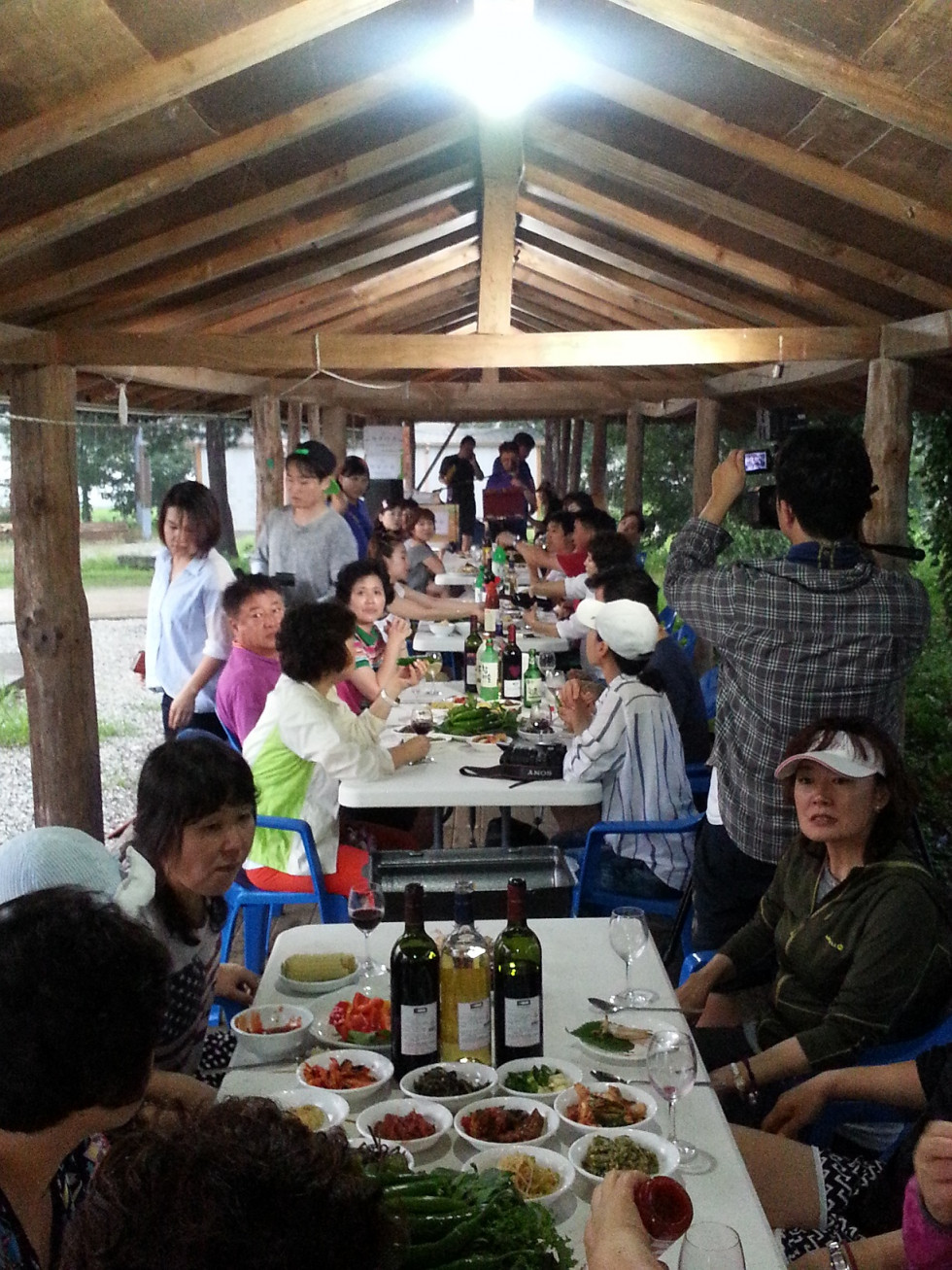 비가오는 원두막에서 분위기 있는 통기타 연주와 노래를 들으며 와인을 곁들인 바베큐와 5일 양구시장에서 구입한 식재료를